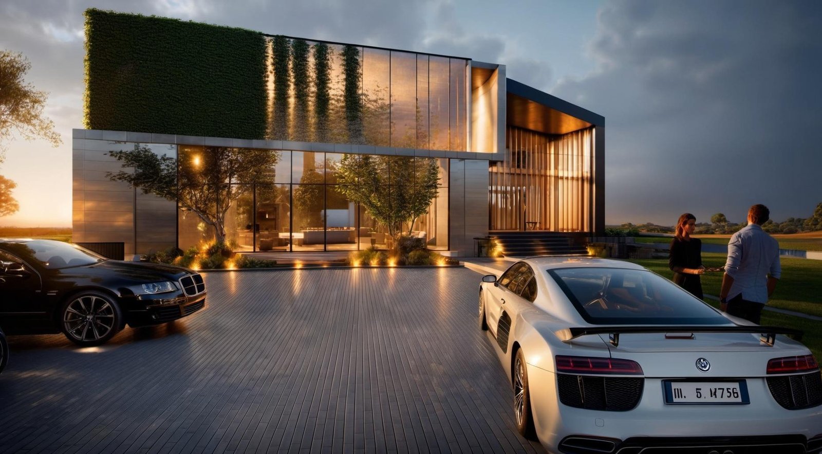 architectural concept harmonizes sculptural geometry, warm materials, and transparent façades to create a home that is both expressive and intimately connected to its surroundings.
