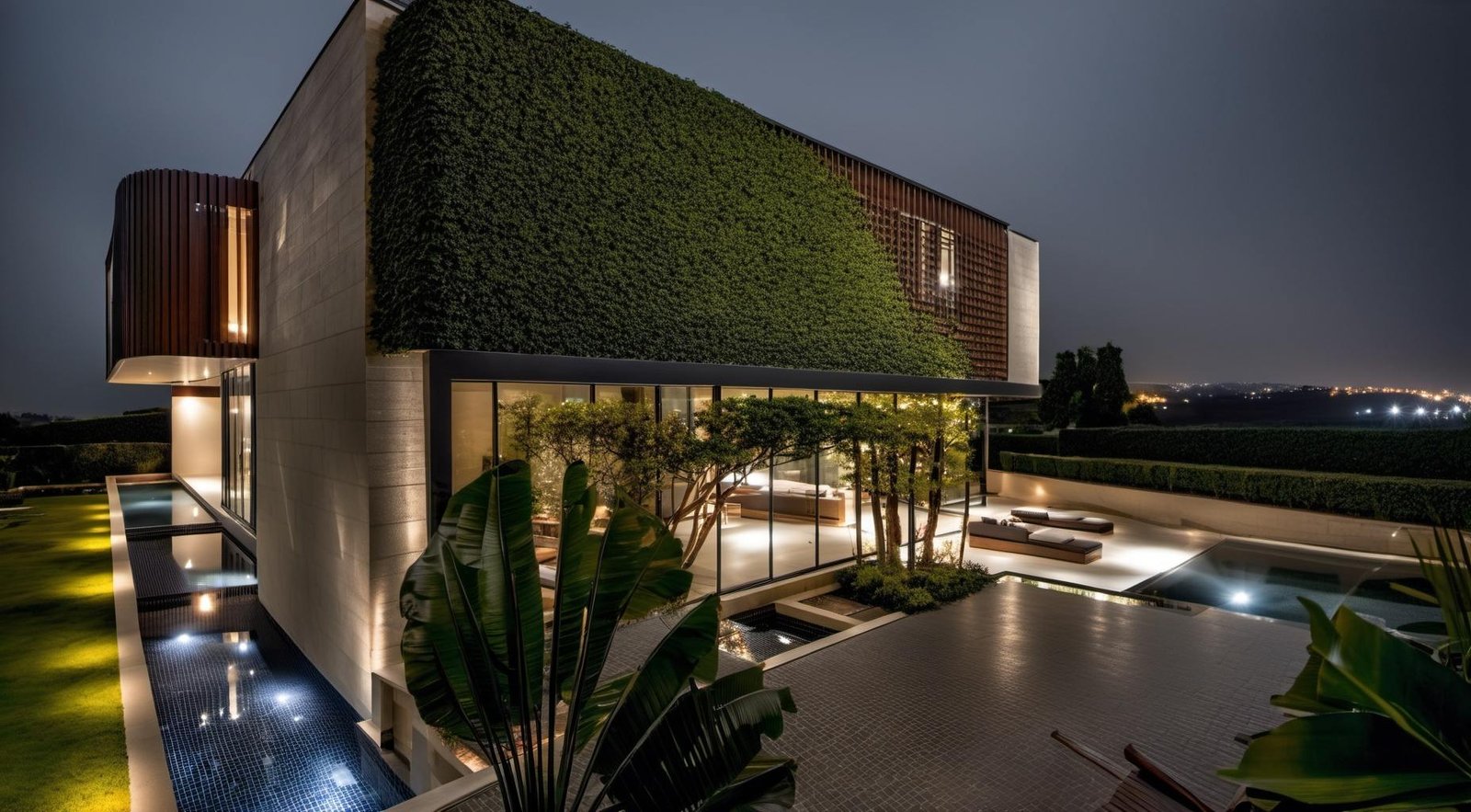 A large pool terrace extends toward the landscape, framing distant mountain views and enhancing the home’s resort-like atmosphere. At night, integrated lighting emphasizes the vertical geometry and creates a dramatic