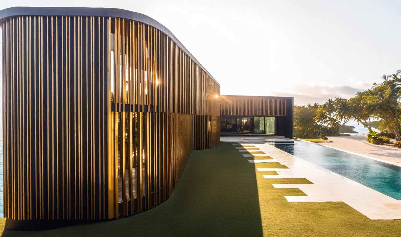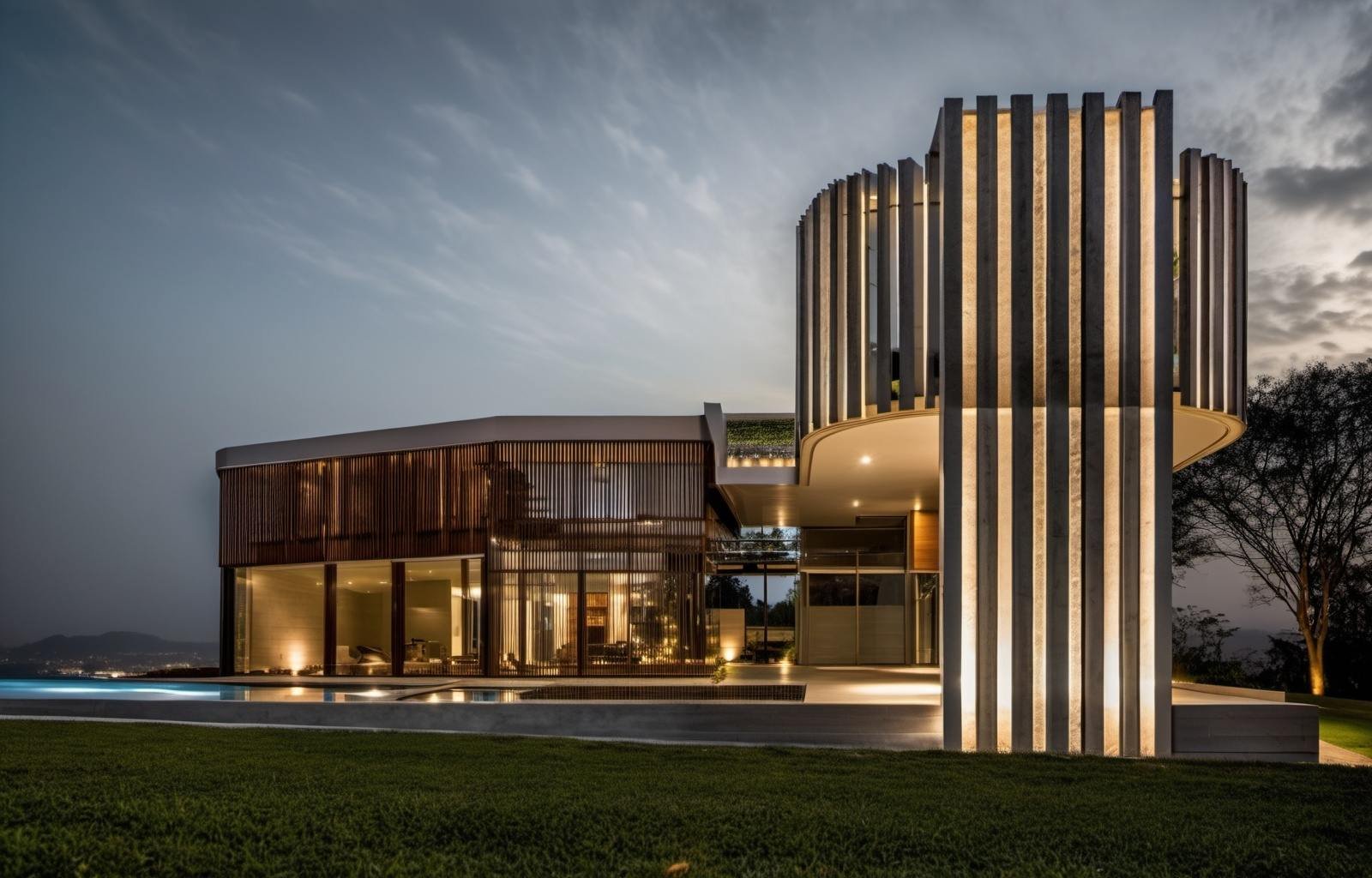 The residence is composed of two primary elements: a horizontal wing with floor-to-ceiling glazing and wooden lattices, and a striking vertical cylindrical tower wrapped in rhythmic concrete fins. These elements are