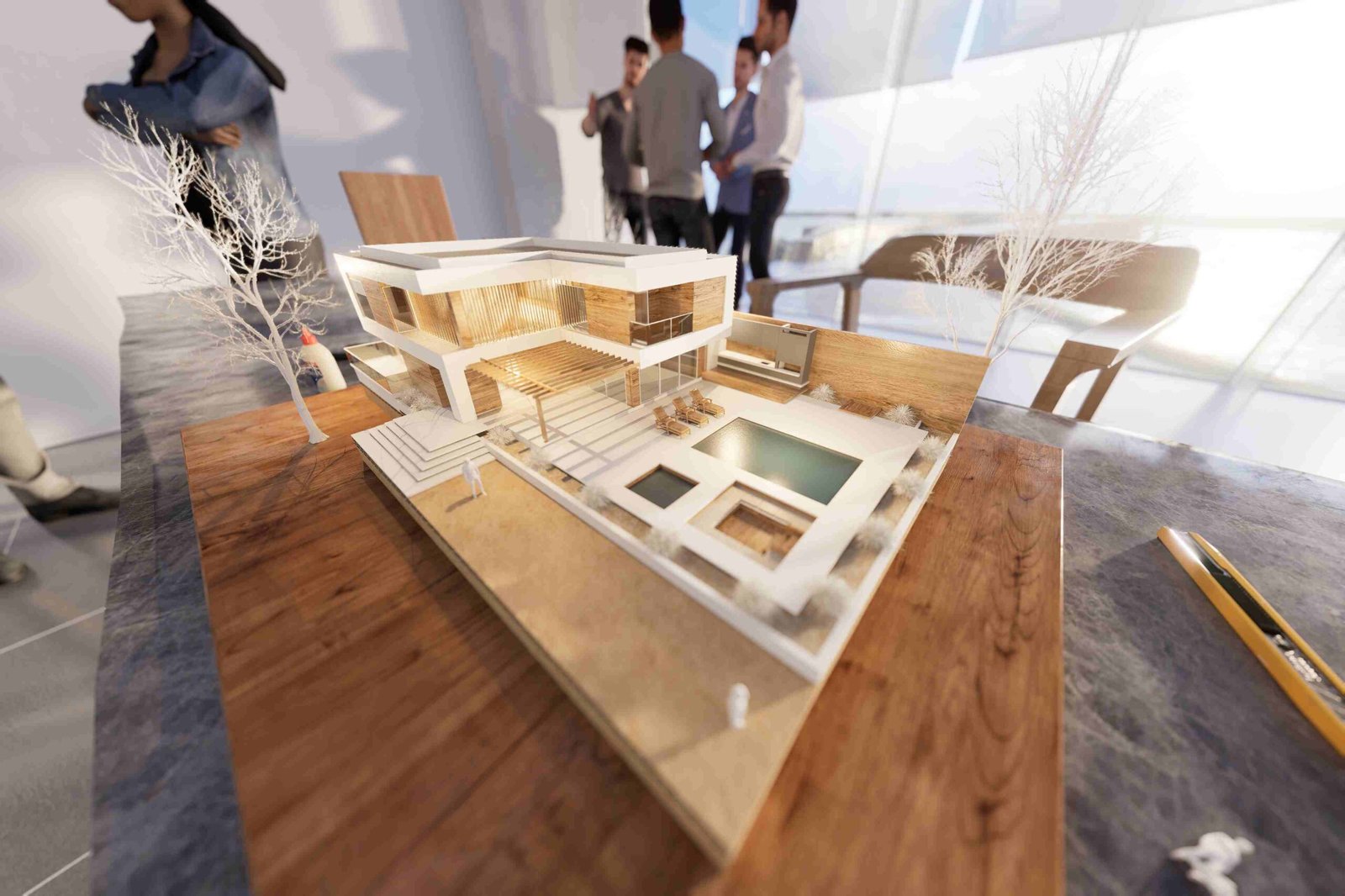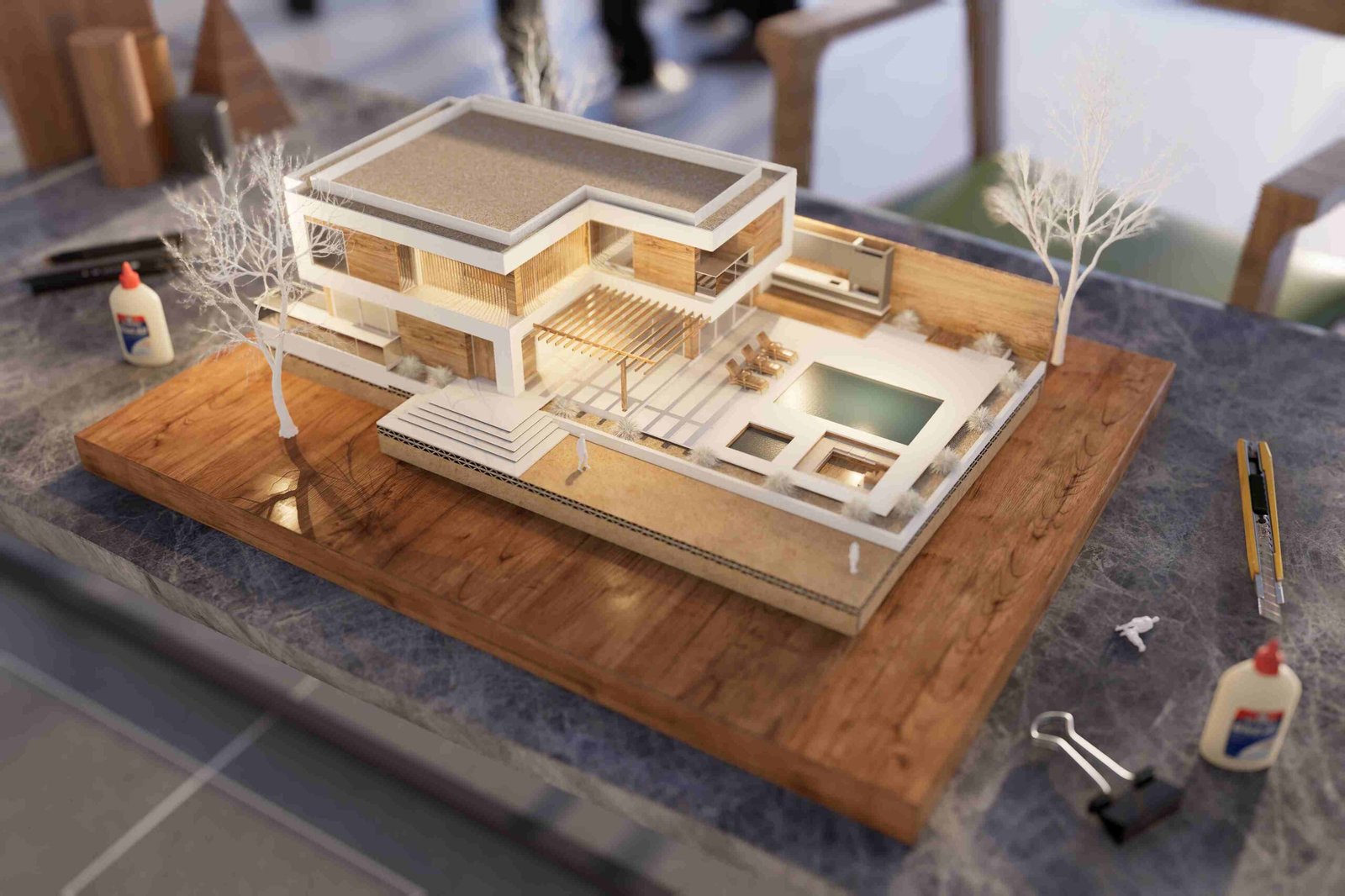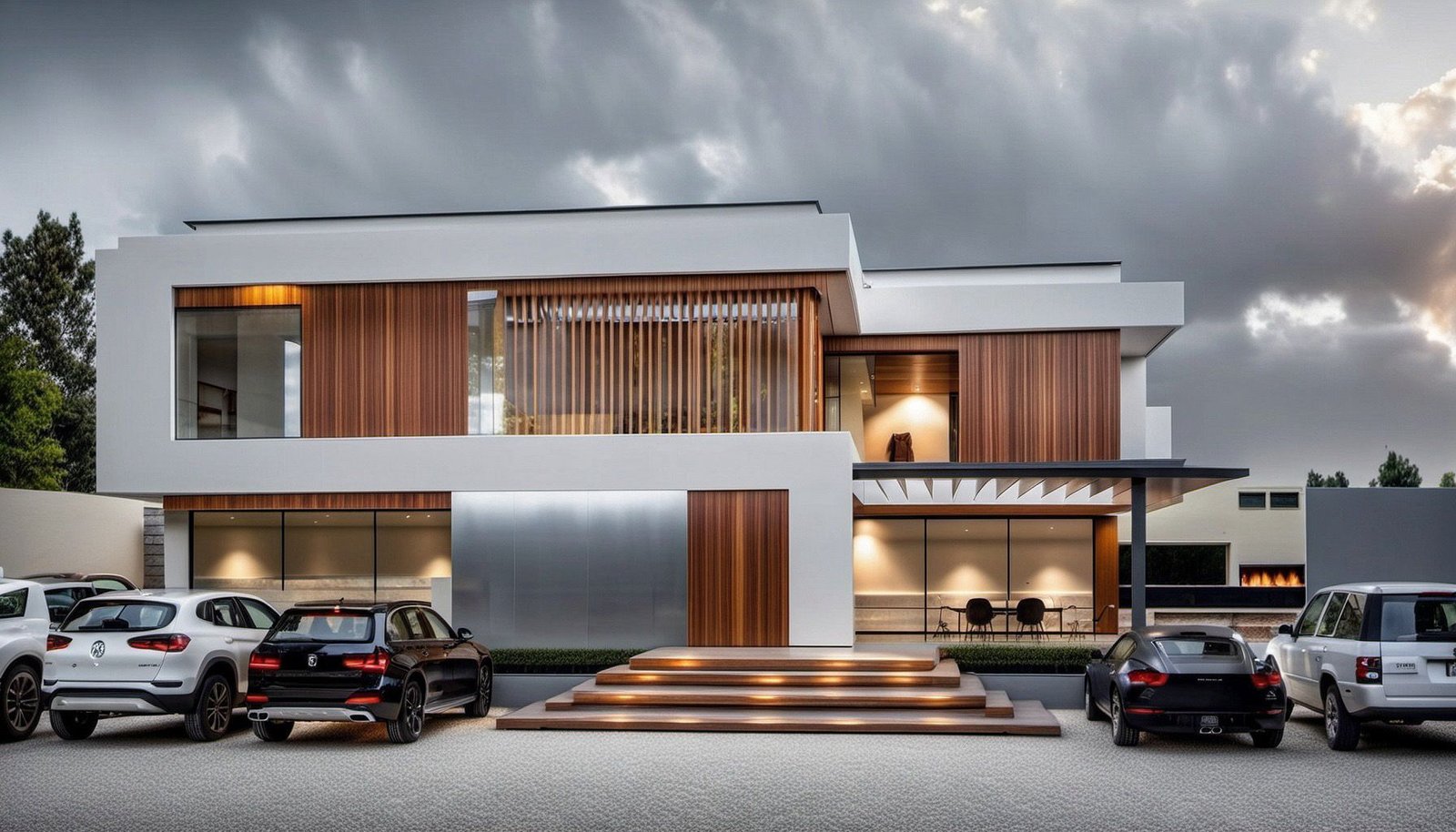 volumes with warm wooden accents to create a balanced atmosphere of sophistication and comfort.