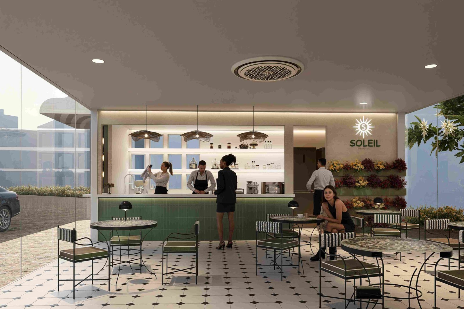 The outdoor terrace is designed as the heart of the project—airy, bright, and framed by greenery . The interior bar is compact yet highly functional, offering curated beverage preparation, display shelving, and efficient