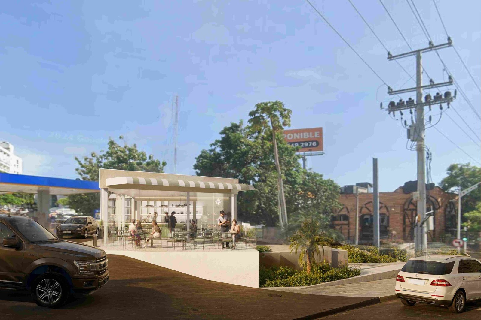 Through BIM methodology, the design team coordinated the curved glazing, custom furniture, awning structure, and interior shelving with millimetric precision. Material selection focused on durability suitable for tropical