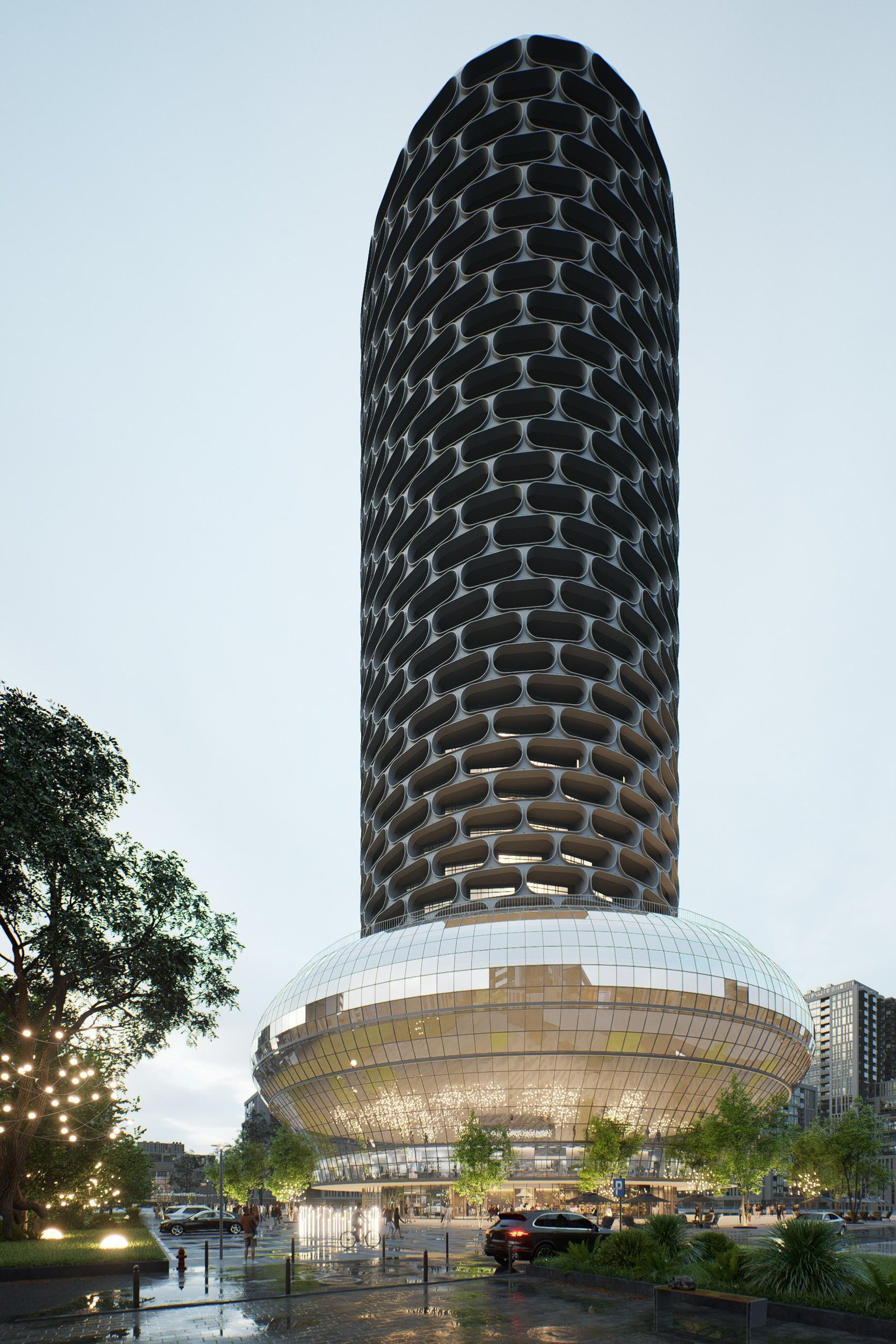 The sculptural lower volume is designed to anchor the project within the urban setting while creating opportunities for retail frontage, pedestrian circulation, and public-facing amenities.